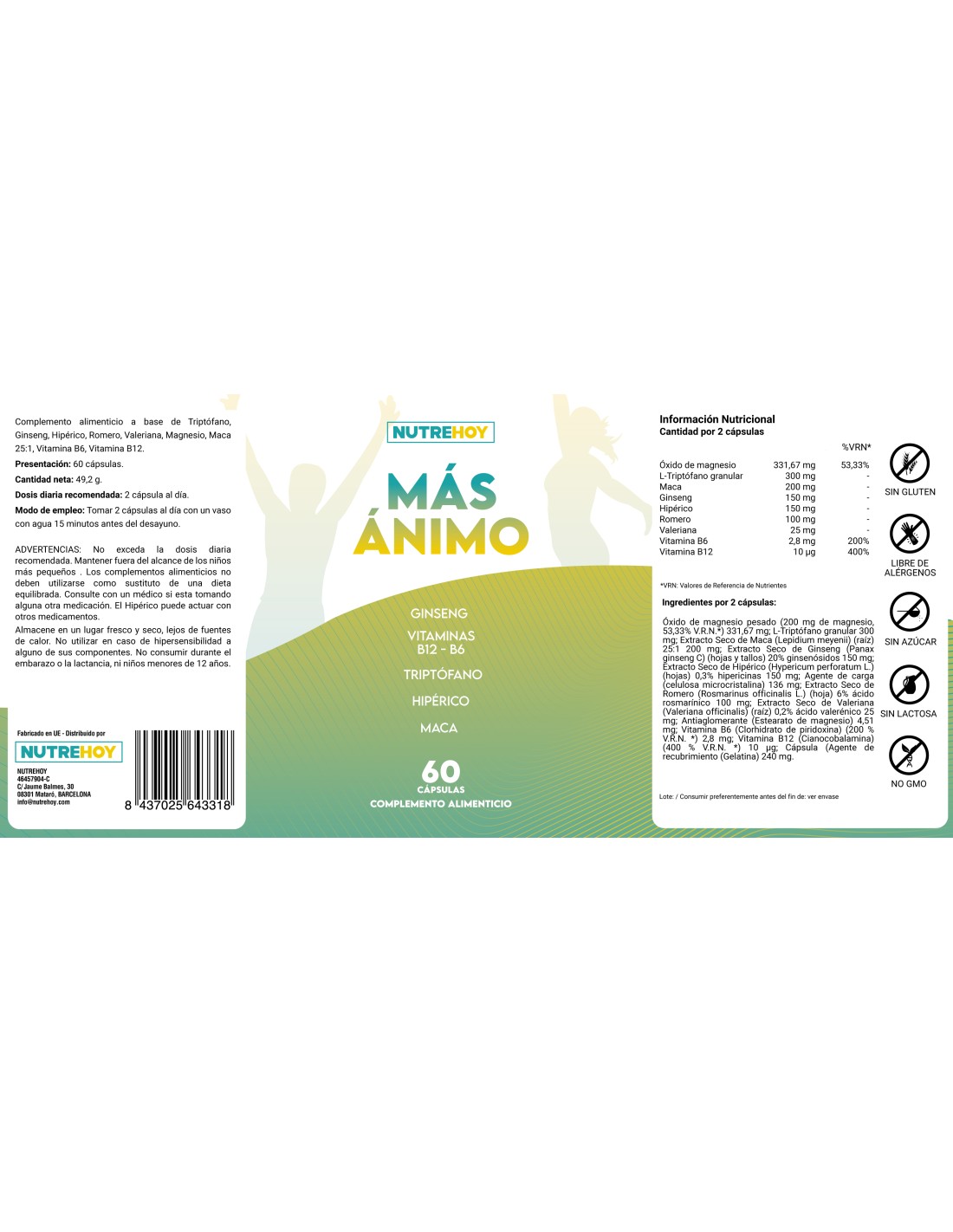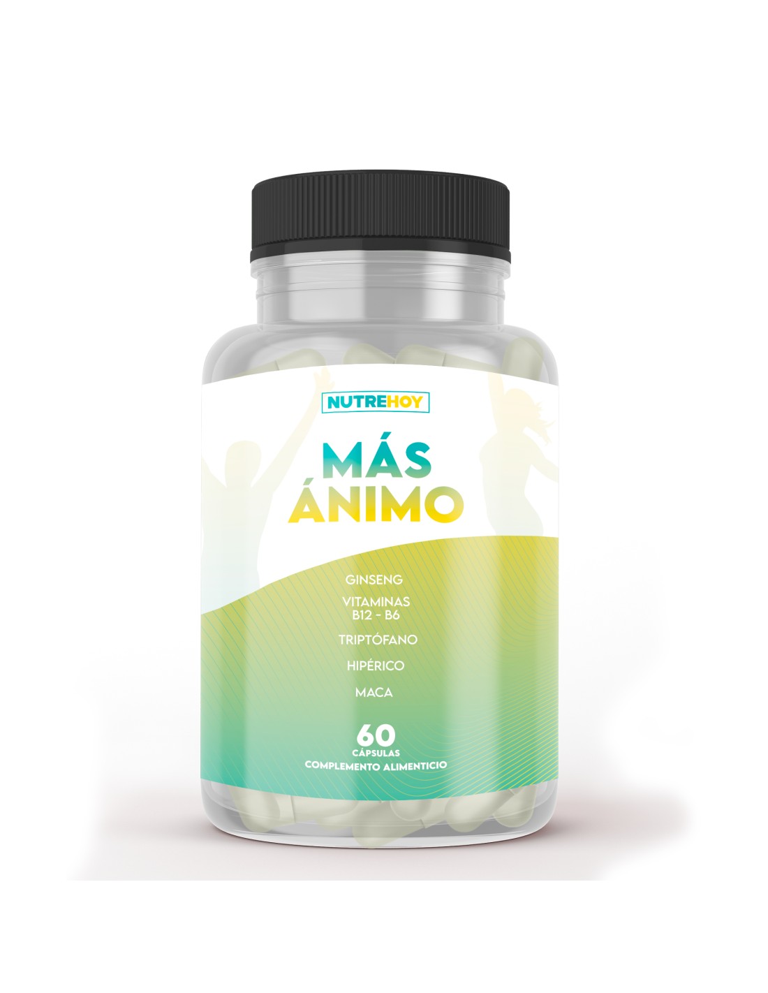 El producto Más Ánimo de Nutrehoy es una solución efectiva para combatir el estrés, la ansiedad y la fatiga. Está diseñado para mejorar el estado de ánimo y aumentar la energía y la vitalidad. Contiene una combinación de ingredientes naturales, incluyendo Hipérico, Triptófano Puro, Maca, Ginseng, Romero, Valeriana, Vitamina B12 y Vitamina B6, que trabajan juntos para ofrecer una experiencia más positiva y activa.