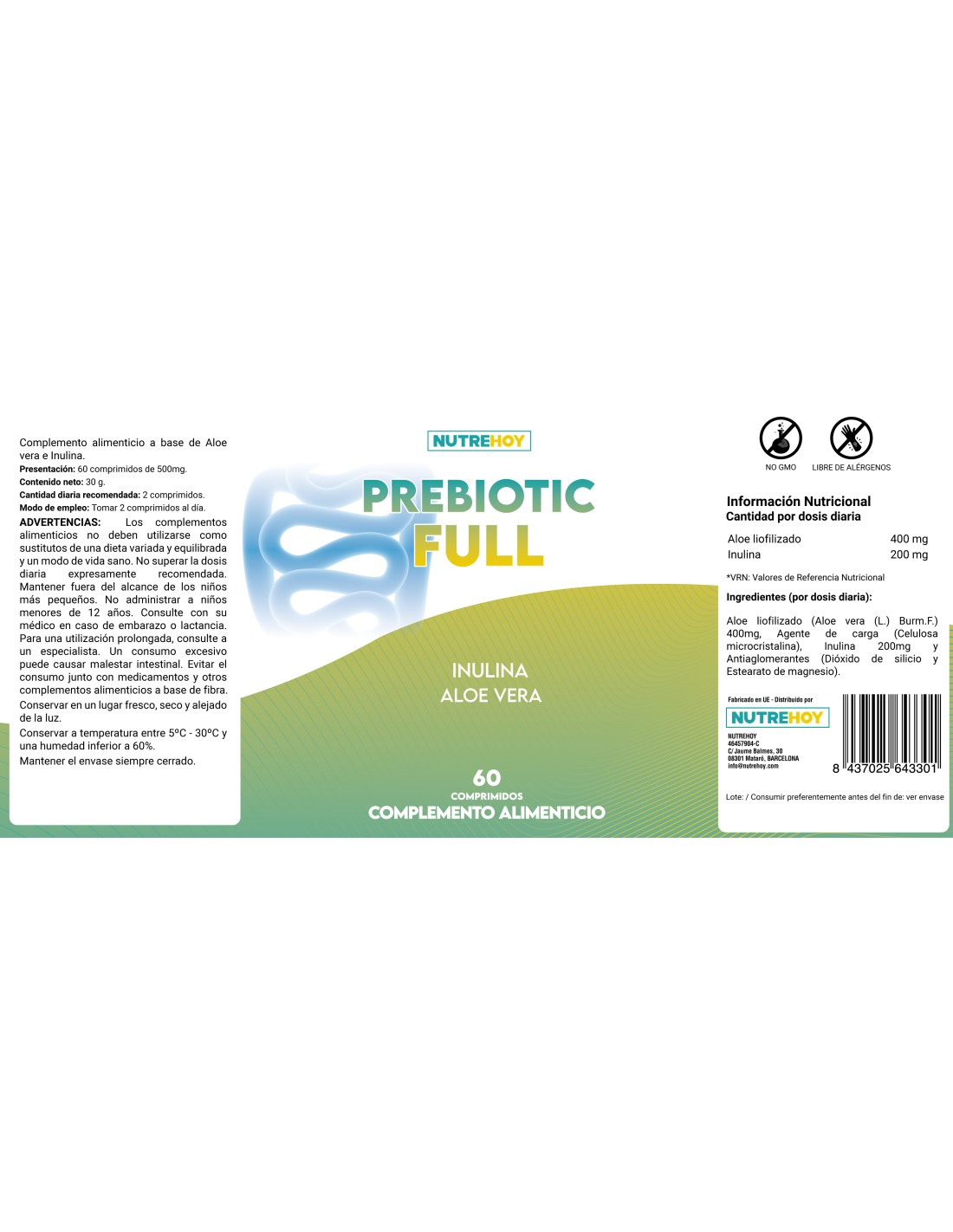 Prebiotic Full es un prebiótico con aloe vera e inulina (10 mil millones UFC). Consigue regular el tránsito intestinal y nos ayuda a mejorar la digestión. También previene el estreñimiento y depura e elimina toxinas. Contiene 60 comprimidos.