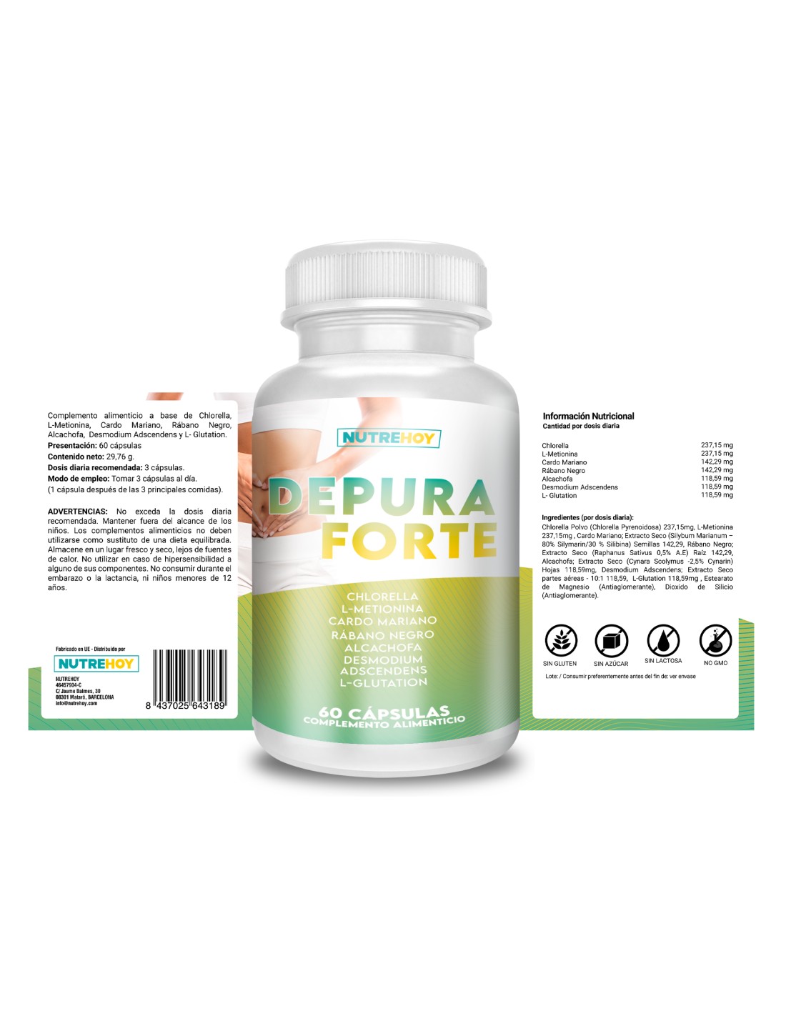 Depura Forte contiene Cardo Mariano, Rábano negro y Alcachofa, todos ingredientes conocidos por sus propiedades digestivas. El Cardo Mariano es una planta medicinal que se ha utilizado durante siglos para tratar problemas digestivos y hepáticos, mientras que el Rábano negro es una raíz conocida por sus propiedades estimulantes para la digestión. La Alcachofa es una verdura que se ha demostrado que mejora la digestión y reduce la hinchazón abdominal.